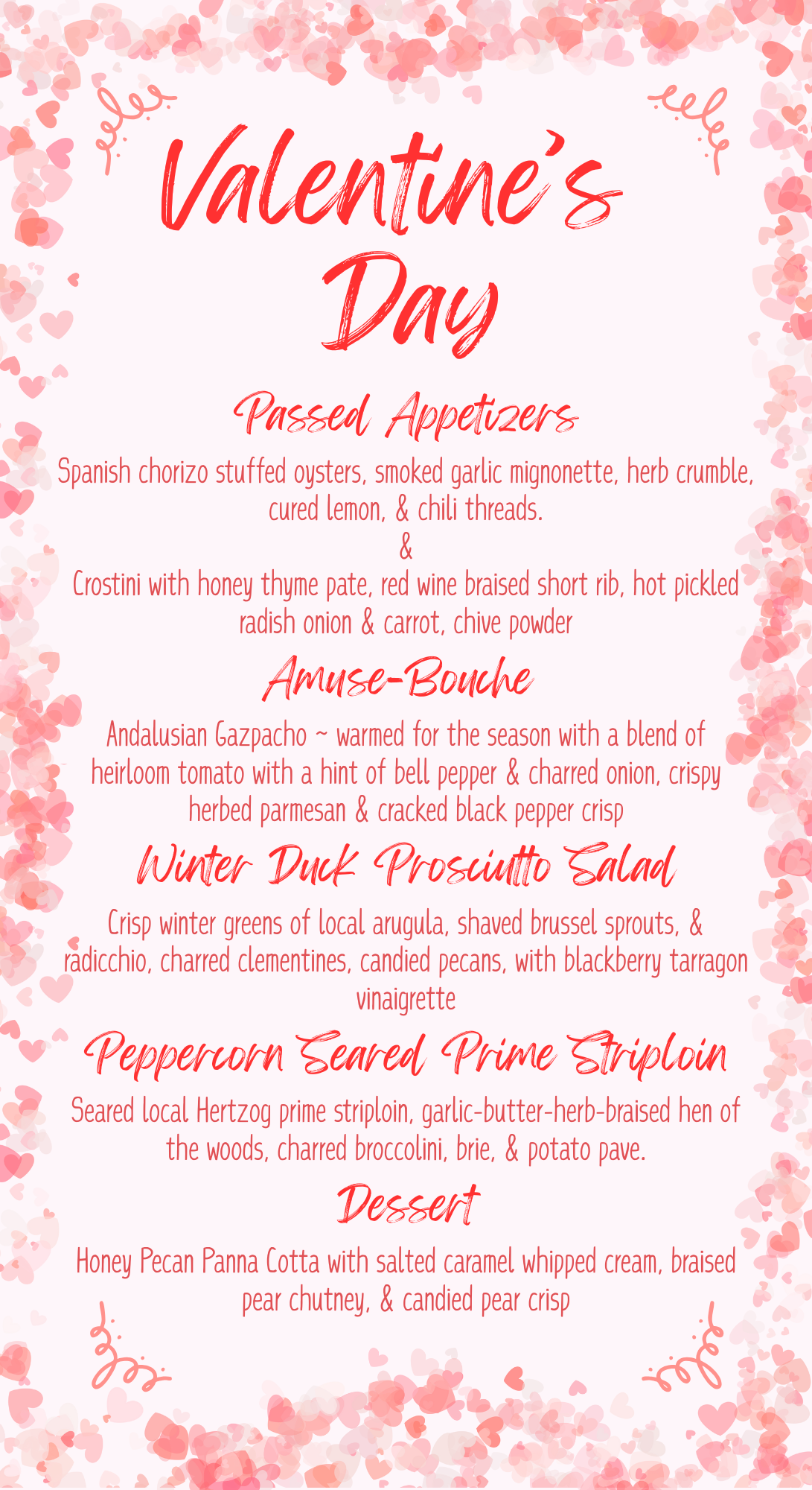 Description:Celebrate Valentine’s Day with an evening defined by elegance, indulgence, and culinary artistry. Our Valentine’s Day Wine Dinner is a six-course tasting experience designed to honor the beauty of food, wine, and connection. Each course is thoughtfully composed using exceptional ingredients and precisely paired with a wine selected to elevate flavor, texture, and aroma. The evening is marked by subtle details, unhurried pacing, elegant presentation, and a setting that feels intimate and sophisticated. This Valentine’s Day Wine Dinner is an invitation to indulge in the luxury of time, taste, and shared moments, where every course is a celebration of balance, craftsmanship, and quiet romance.