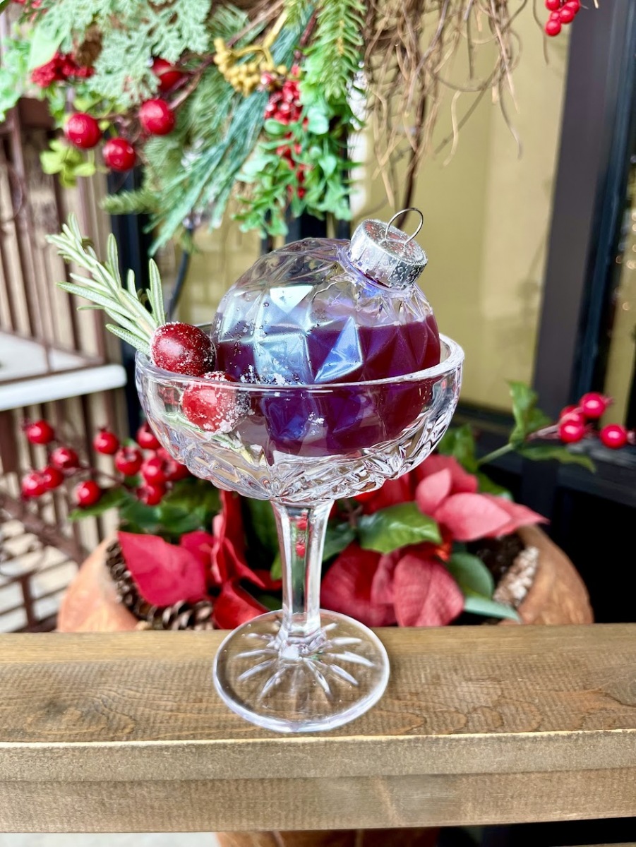 Ornamentini: A playful cocktail served in an actual ornament! Features Starlight Distillery's blackberry whiskey, raspberry liqueur, vanille de Madagascar, and lemon juice. Delightful when poured over rosemary and cranberries.